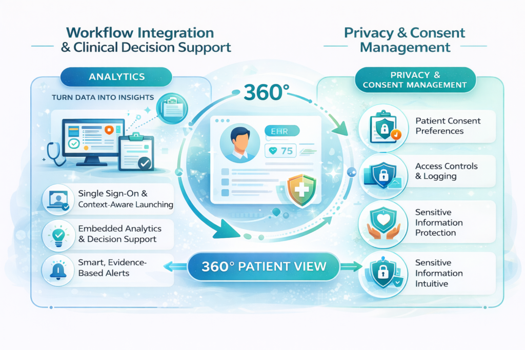 The 360-degree patient view should be integrated into existing clinical workflows rather than requiring users to navigate to a separate system for specific tasks. Single sign-on capabilities reduce authentication friction, and context-aware launching allows users to open the patient view directly to a specific patient context from EHRs or other applications. Embedded analytics and decision support provide insights and recommendations at the point of care when they are most actionable.