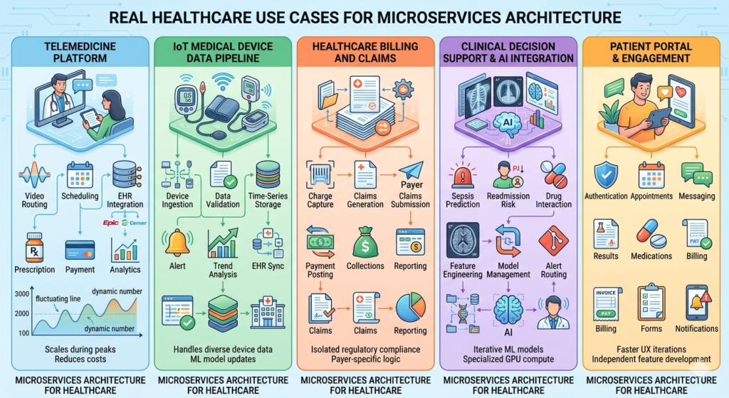 Database diversity: Different healthcare data types have different storage needs. Microservices enable: