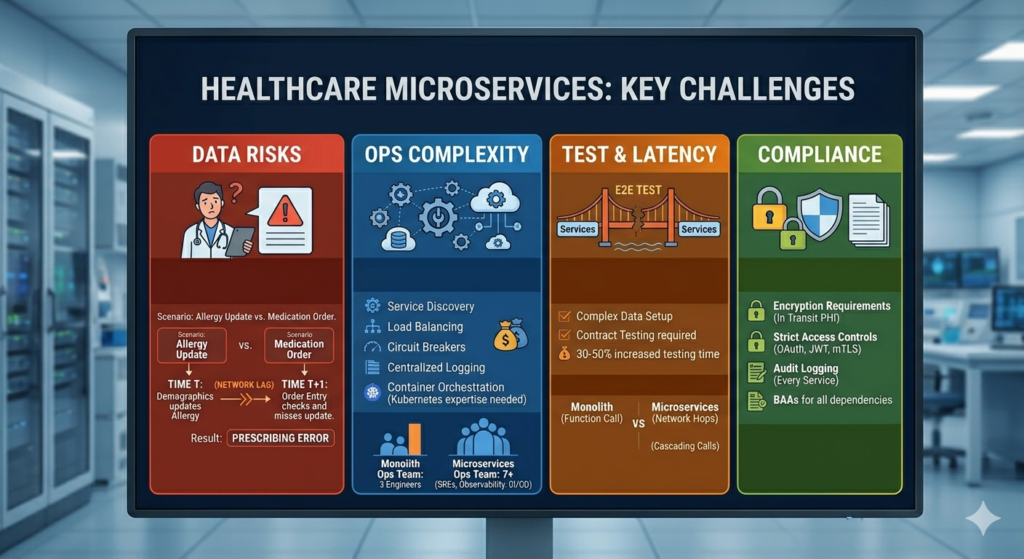 Regulatory weight: HIPAA, HITECH, state privacy laws, and international regulations like GDPR create compliance overhead for every service boundary. Each API call between services carrying PHI (Protected Health Information) becomes a potential audit point and security vulnerability.