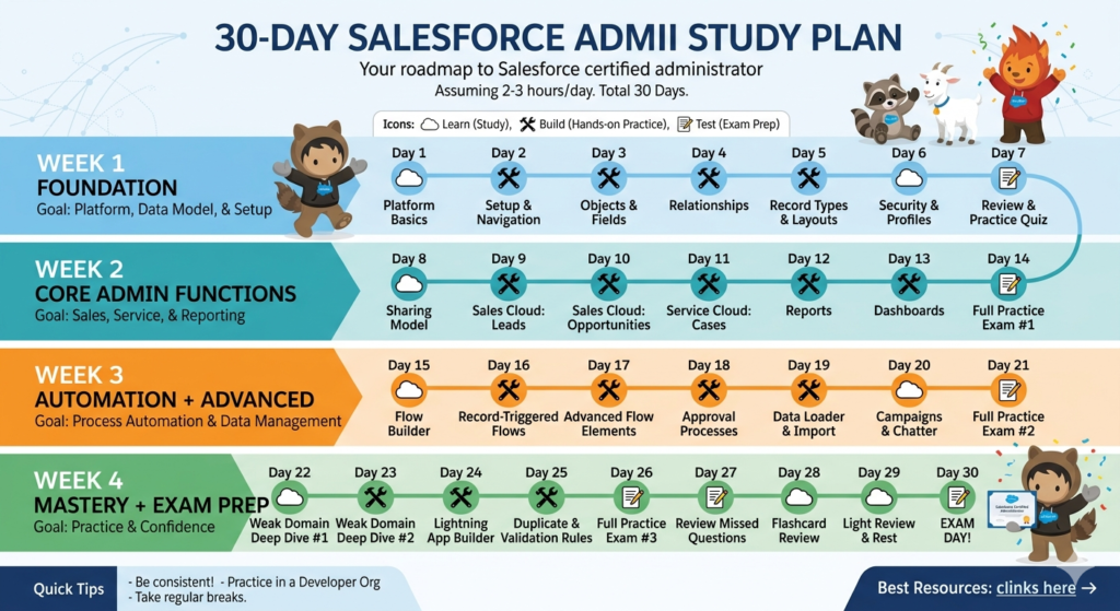 You now have a complete Salesforce admin certification guide — a 30-day study plan, the best resources, the most common pitfalls, and honest career advice.