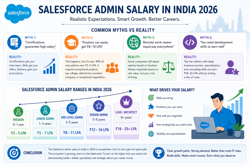 Reality: This happens, but it’s rare. It requires exceptional circumstances—stellar projects, top-tier college, referral into a product company, or exceptional negotiation. The Salesforce fresher salary for 90% of new admins is ₹3–5 LPA.