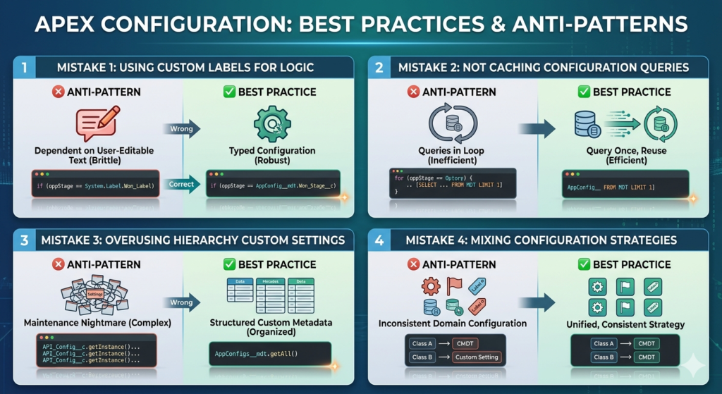 Custom Settings were once the default solution. They offer fast access and simplicity, but they lack modern deployment flexibility and can create issues in multi-environment setups. Custom Labels, while useful, are often misused by developers trying to avoid proper design—they are meant strictly for text and translation, not for application logic or structured configuration.