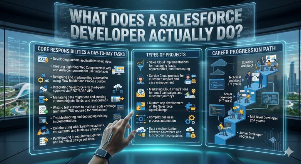 - Developing custom applications using Apex (Salesforce’s proprietary programming language)