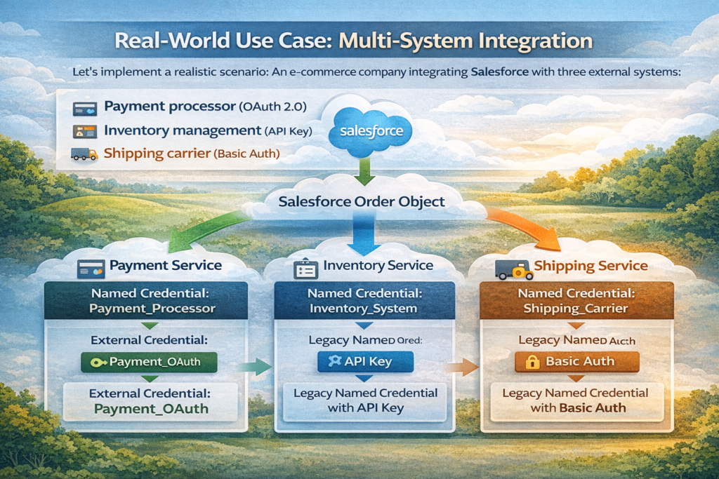 For complex integrations involving multiple systems, the pattern shown in the e-commerce example demonstrates how to orchestrate multiple Named Credentials with proper error handling and rollback logic.